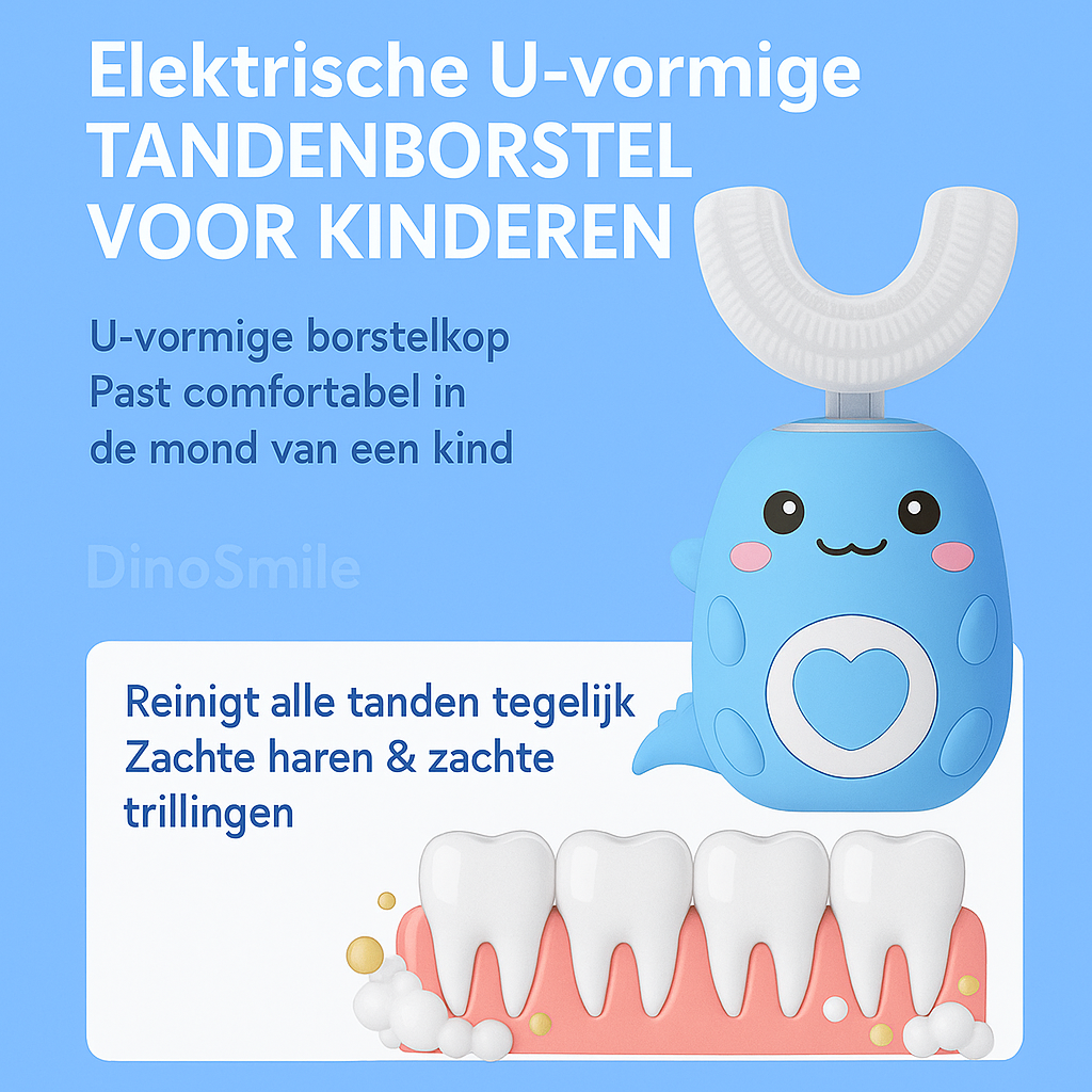 Dankzij het slimme U-vormige ontwerp van de DinoSmile worden alle tanden tegelijk omsloten. Zo worden ze grondig gereinigd en wordt tot wel 82% meer tandplak verwijderd dan bij handmatig poetsen.